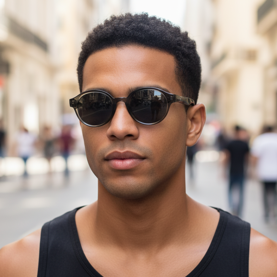 Óculos de sol unissex redondo em acetato com lente fumê. Fique moderno e estiloso com nossos óculos, projetados para pessoas que não têm medo de expressar sua individualidade! Combinando elegância e tendências atuais, este acessório é a escolha perfeita para elevar qualquer look.